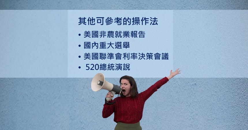 除了〈期貨事件操作法〉 1 、 2 、 3 介紹的操作策略,其他尚有「美國聯準會( FOMC )利率決策會議」、「 520 總統演說」等操作法。